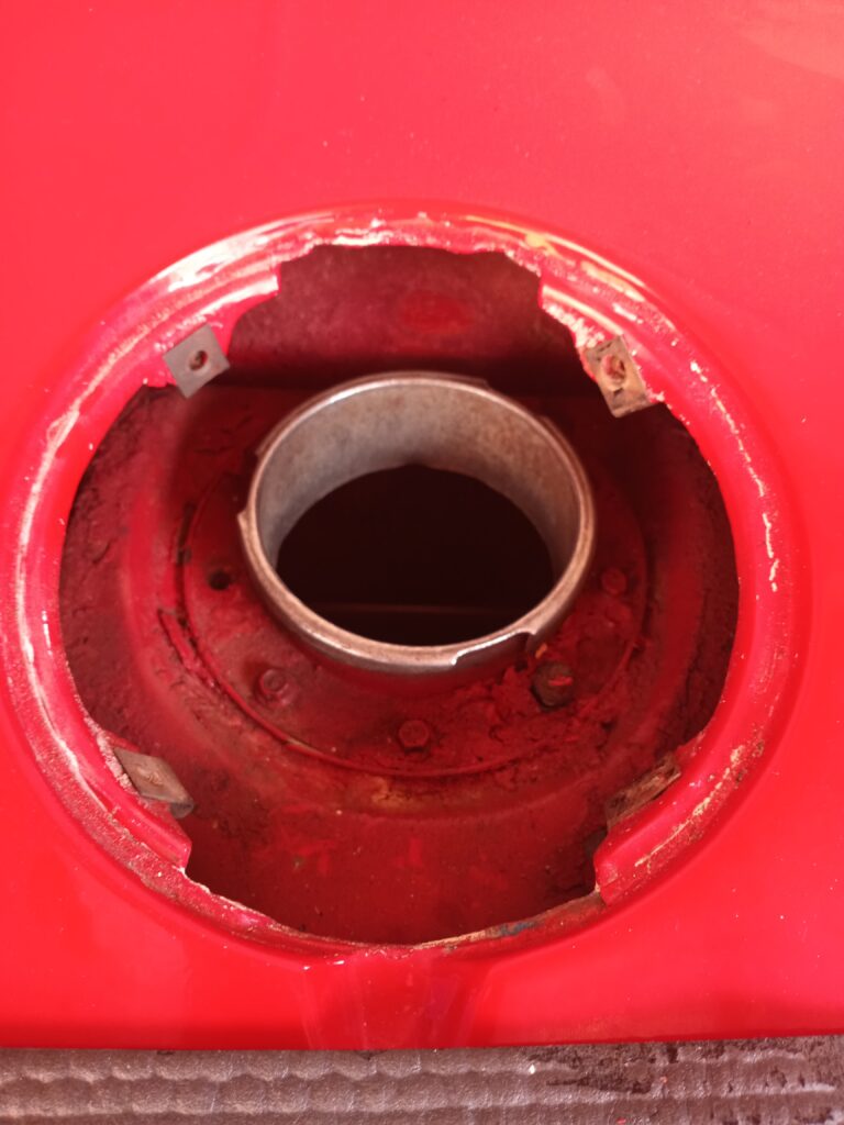 This is how it was at the beginning. There’s a cork gasket in between the tank and the filler neck. It was gone by the time I got the car. When I filled the gas tank up past half way, gas would slosh all over. Stinking up the cabin. Gross.