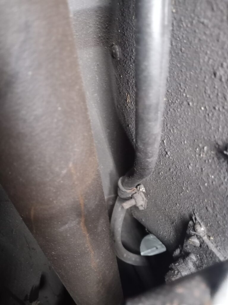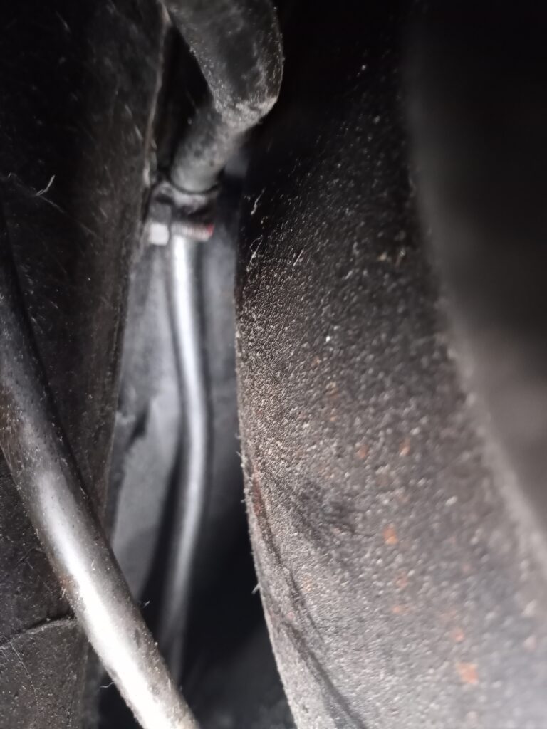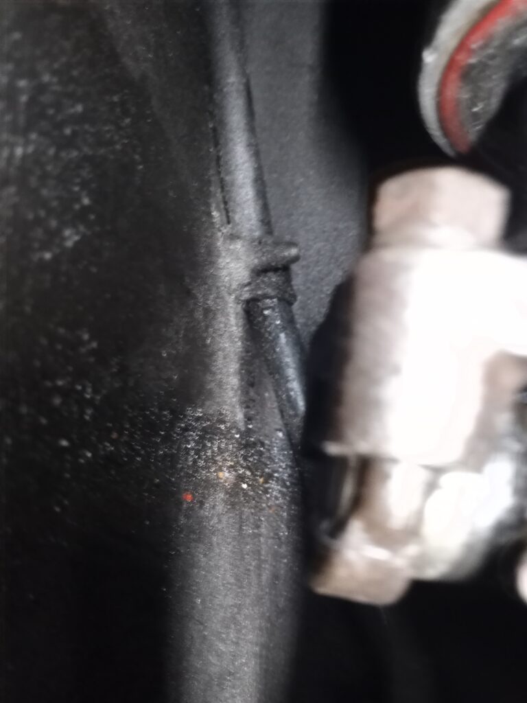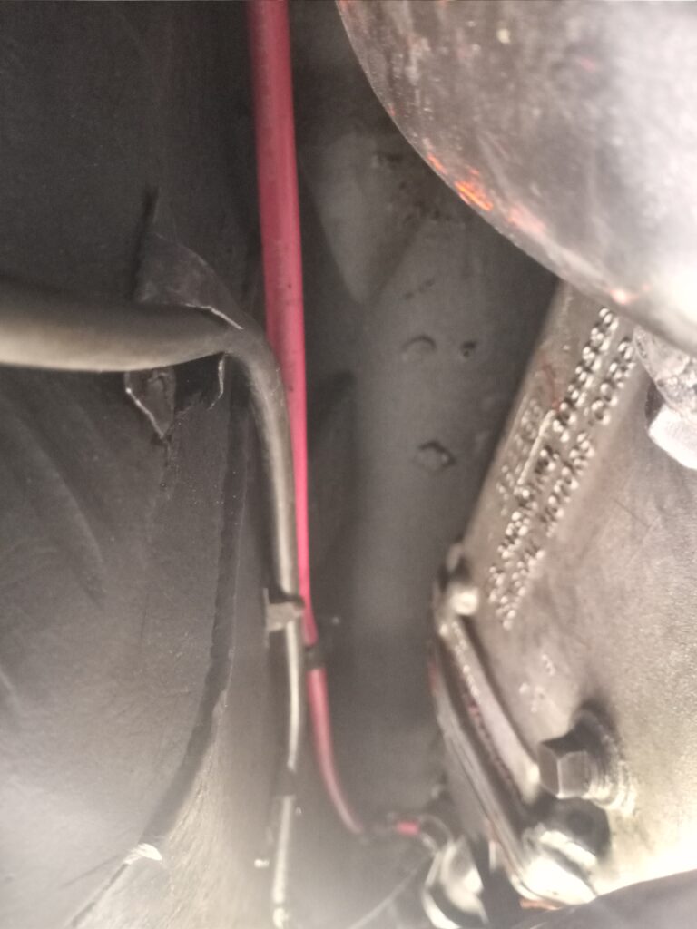 Getting up there to clean with the driveshaft in was pointless. This stuff needs to be scraped out with a blade. So I pressed on. There’s three components. You have posts, brackets, and clips. Posts are threaded so you can tighten the bolt onto them. The brackets are fixed onto the cable, then go over the post, then you put a nut on the post and tighten. The last and most painful are the clips. They’re metal formed into the body, you put the cable into the metal and bend the metal, which hugs the cable to the body. This is where all the cuts came from.